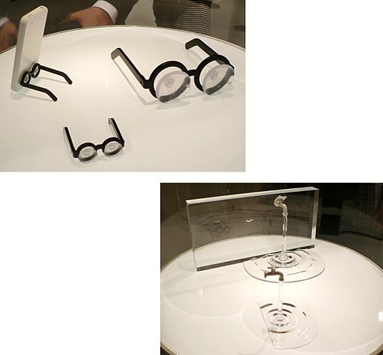 スマートフォンスタンド。メガネデザインの「megane」と、水道の蛇口をイメージした「JAGUCHI」。