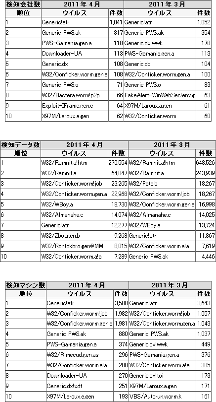 ウイルスは、過去数か月の傾向と大きな変化はないが、W32/Conficker.wormについては、検知会社数、検知データ数、検知マシン数のすべてのランキングでトップ10に入っている。W32/Conficker.wormは、Windowsのファイル共有やリムーバブルメディア経由で感染するため、マカフィーは、脆弱性対策だけではなく、感染経路からリスクを排除する包括的なセキュリティ対策を実行するように呼びかけている。