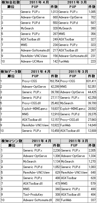 PUP(不審なプログラム)は、従来から大きな変化はない。多くのPUPはインターネットからダウンロードしたフリーウェアなどに付加されているため、マカフィーはフリーウェアの利用には十分な注意が必要としている。
