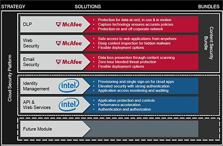 「McAfee Cloud Security Platform」は、マカフィーとインテルのセキュリティ機能を組み合わせて、メールセキュリティ、ウェブセキュリティ、ユーザーID管理など、企業とクラウドの間でやり取りするすべてのコンテンツやデータトラフィックを保護する統合型クラウドセキュリティ。