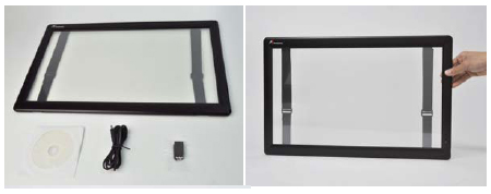 縦横比16:9の21.5インチまたは22インチワイド液晶ディスプレイに装着するだけで、タッチ機能対応にできる外掛け式のタッチパネル用フレーム。PCとはUSB2.0で接続し、フレームの左右にあるマジックテープ式のバンドで簡単に取り付けられる。