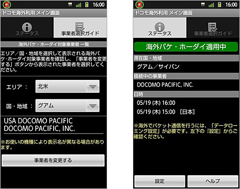 「ドコモ海外利用」は、「海外パケ・ホーダイ」の設定サポートや適用状況の確認、国名や事業者名、現地時刻と日本時刻の表示、地域別の事業者名の確認などができるアプリ。ドコモマーケットからダウンロードする。利用料金は無料。