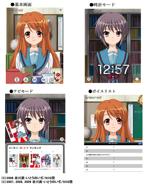 モーションポートレートと角川書店は、完全新規収録音声を収めたiPad用アプリ「アニメロイド『長門有希のBOOK☆WALKERナビ』」「アニメロイド『朝比奈みくるのBOOK☆WALKERナビ』」を発売した。