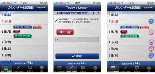 「TOEICカレンダー」は、カレンダーでTOEICテストなどの受験日・申込締切日をチェックし、受験日までの日数をカウントダウンする便利なアプリ。さらに、「Today’s Lesson」として、毎日3問英語の問題を配信し、全問正解するとカレンダーに花丸がつく。スケジュールは、登録すればスマートフォンのGoogleカレンダーに反映させることもできる。