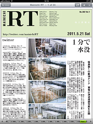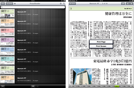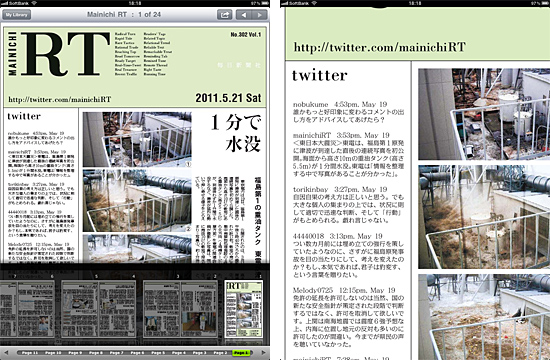 さらに、「MAINICHI RT」のアプリを端末にインストールし、パソコン版の登録メールアドレスとパスワードでログインすると、iPhone/iPod touch/iPadで「MAINICHI RT電子新聞」を読むことができる。アプリを起動すると、未取得の最新版のダウンロードを開始。24ページ分のデータをダウンロードしてから紙面を表示する。アプリから定期購読の申し込みもできるが、その場合パソコン版は購読できず、新たに申し込む必要がある。近日中に、Android端末用のアプリもリリースする予定。