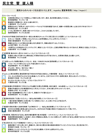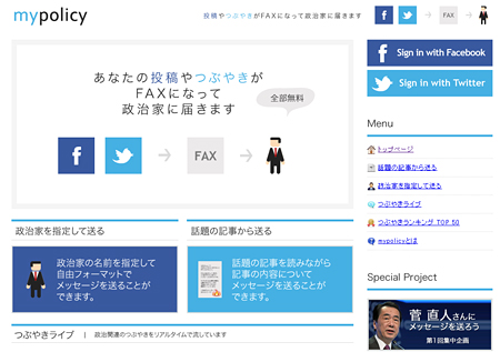「mypolicy」は、サイト「mypolicy」(http://mypo.li/)からTwitter、Facebookに投稿された文章を、投稿する際にユーザーが指定した政治家にFAXで送信するサービス。1週間分の投稿を、毎週金曜日の午前10時に政治家に配信する。