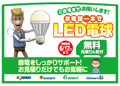 家電量販店「エイデン」「デオデオ」「ミドリ」などを運営するエディオンは、従来の白熱電球に比べ消費電力が低く、節電効果の高いLED電球への交換をサポートする「LED電球 無料見積り&無料取付 訪問サービス」を、6月1日から6月17日まで実施する。