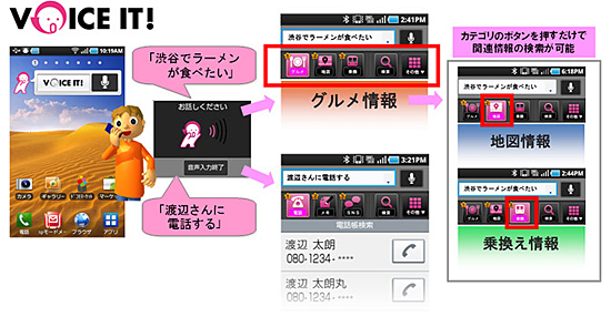 ブリリアントサービスが提供する「VOICE IT!」は、検索する内容をスマートフォンに話しかけると、内容に合わせてサイトに誘導するアプリ。例えば、話した内容が食事に関することなら、グルメサイトを表示し、さらに細かい内容の検索を行う。また、電話やメール、カメラなど、スマートフォン端末の機能を音声で起動することもできる。