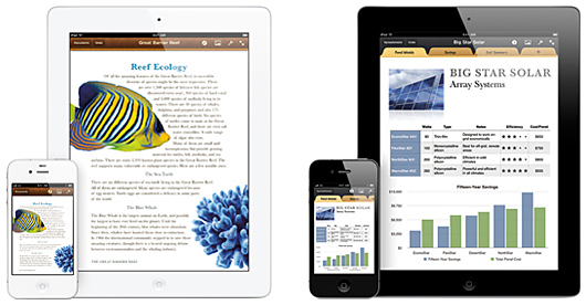 「Keynote」「Pages」「Numbers」は、Mac用統合ソフト「iWork」に収録する同名のアプリケーションを、iOSとマルチタッチインターフェース用に再設計したもの。「Keynote」はプレゼンテーション、「Pages」はドキュメント、「Numbers」はスプレッド(表計算)シートを、iPhoneなどのiOSデバイス上で、作成・編集・閲覧することができる。