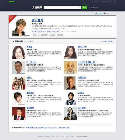 インターネット検索サービス「NAVER(ネイバー)」を運営するネイバージャパンは、6月1日、国内・海外の有名人に関する情報を横断的に検索・閲覧できる「NAVER人物検索」(http://person.naver.jp/)を開始した。