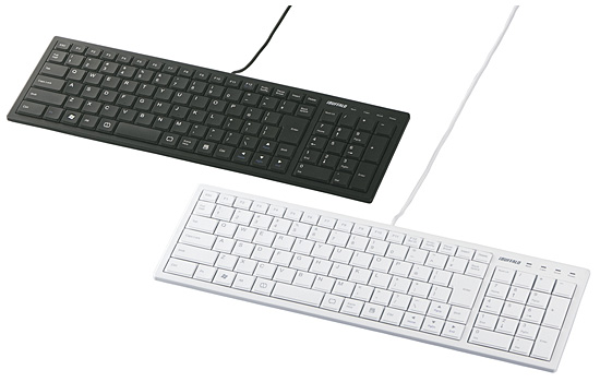 かな表記のないスマートキートップを採用。さらに、文字をキーの左上に配置しているので、印字文字が劣化しにくい。カラーはシックなブラック(BSKBU08BK)と美しいホワイト(BSKBU08WH)の2色。サイズは幅384×奥行き124×高さ19mm、重さは約550g。対応OSはWindows 7/Vista/XP。