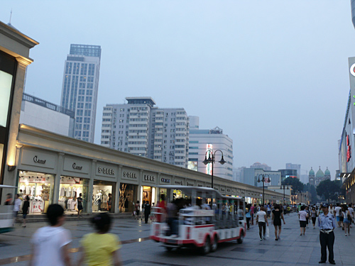 ヤマダ電機天津本店は、天津市の中心街の一つである南京路に位置し、地下鉄堂口道駅を出てすぐに目に入る場所にある。近くには市内最大の歩行者天国、濱江道歩行街があり、さらには観光客やビジネスパーソンが頻繁に利用するラッフルズホテルと直結している。交通の便がよく、人通りが多いという最高の立地条件だ。