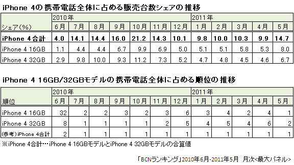 携帯電話全体の販売台数に占める「iPhone 4」(16GBモデルと32GBモデルの合計、以下同じ)のシェアの毎月の推移をみると、2010年10月が21.2%で最も大きく、2011年5月は14.7%で、2010年9月の16.0%に次ぐ3番目の大きさだった。