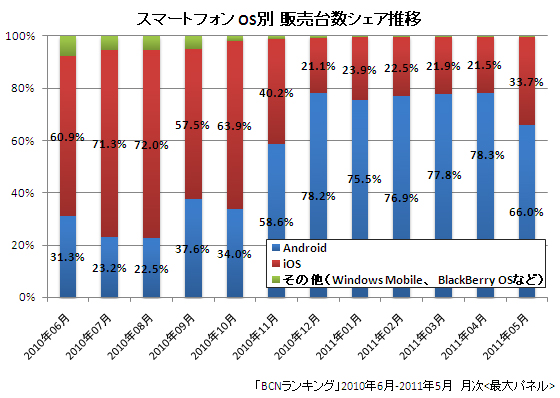 しかし、スマートフォンのOS別販売台数シェア推移を集計すると、2010年11月にiPhoneのOS「iOS」は「Android」に逆転された。2011年5月こそiOSのシェアは33.7%まで回復したが、2010年12月以降、70%台後半のAndroidに対し、20%台前半と低迷していた。複数のメーカーが端末を開発・製造しているAndroid搭載スマートフォンの製品数は、iPhoneとは比較にならないほど多い。実質的に「1対多」ではやむを得ないとはいえ、OS別では「Android」の優勢で固まりつつある。