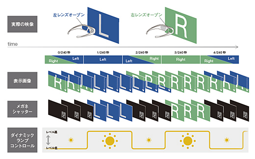 また、シャッターが開いている間に2D映像視聴時より高い輝度でランプを光らせ、左目用と右目用の映像を書き替える間はランプの輝度を下げることで、明るい3D映像を再現する「新ランプ制御方式」を採用した。