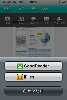 バージョンアップで、「Good Reader」「iFiles」「Evernote」などのファイルビューアーアプリに対応。これらのアプリをiPhoneにインストールしているユーザーは、「クオンプ」に保存したファイルをiPhoneで開くことができる。