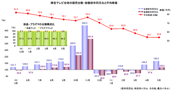 製品別では、5月の最終週に薄型テレビが「北海道・東北」で189.9%、関東で219.8%、全国では192.9%と好調。道越一郎エグゼクティブアナリストは「3月のエコポイント制度の終了による駆け込み需要はなかったが、アナログ停波に向けてテレビは力強い動きを示している。最終特需が立ち上がった」と分析した。全国の5月トータルの実績は、台数が180.2%、金額が120.2%。税別平均単価は5万3800円で、価格の下落基調には一服感が表れた。