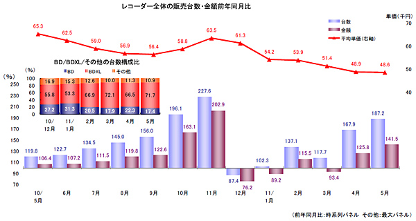 さらに、アナログ停波に向けてレコーダーの地デジ特需が顕在化し、5月最終週は全国で前年比174.0%。全国の5月トータルの実績は、台数で187.2%、金額で141.5%となり、薄型テレビを上回る伸びを示した。税別平均単価は4万8600円だった。