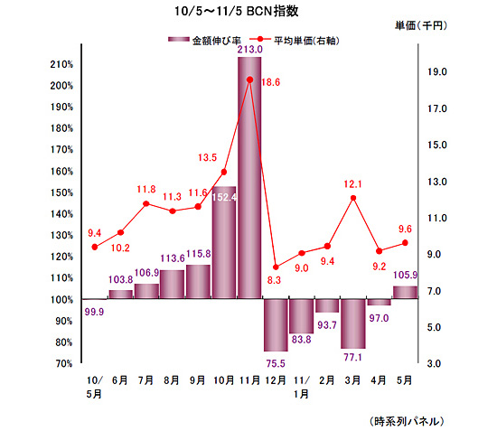 BCNランキングが集信するPCや周辺機器、デジタル家電の実売データから全商品の平均単価と販売金額の前年同月比をまとめた「BCN指数」は、5月、エコポイント制度の見直しに伴うテレビの買い替え特需で伸長した昨年11月以来、半年ぶりにプラスに転換した。