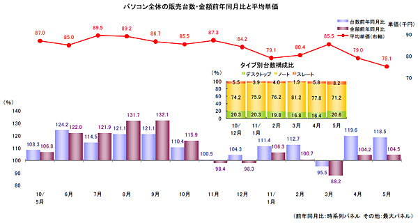 PCは、インテルのCPUの不具合によって各社の新製品の発売が遅れたことと、震災の影響で、例年は3月の商戦が4月にシフト。旧OSからの買い替えが後押し、台数ベースでニケタ増を維持している。一方、税別平均単価は3月の8万5500円をピークに下落。5月は7万5100円となった。