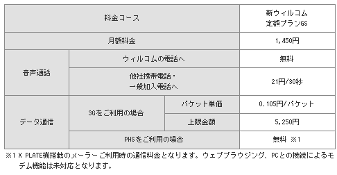 提供料金コースは「新ウィルコム定額プランGS」のみ。月額料金は1450円で、ウィルコムの電話への音声通話は無料。データ通信はPHS利用時は無料、ソフトバンクモバイルのネットワークを利用した3G通信の利用時は、上限金額5250円の従量課金制となる。