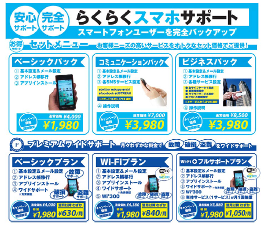料金は、基本設定&メール設定、アドレス帳移行、アプリインストールをセットにした「ベーシックパック」が1980円(通常価格4000円)、「コミュニケーションパック」「ビジネスパック」が3980円(通常価格7000円/8500円)、「ベーシックパック」にワイドサポート(修理代免責保証)がついた「ベーシックプラン」が初回1980円(通常価格4000円)、翌月以降月額630円など。なお、ワイドサポート(修理代免責保証)は中古品は対象外で、各通信キャリアが提供する保証サービスと、ソフマップが提供する「プレミアムCLUB 」への加入が条件となる。