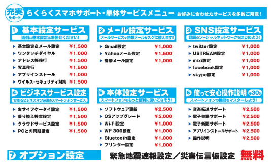 このほか、「基本設定サービス」「メール設定サービス」「SNS設定サービス」「ビジネスサービス設定」「本体設定サービス」「使って安心操作説明(各30分)」「オプション設定」の業界最多となる7ジャンル計30種類のサービスメニューを用意する。例えば、「SNS設定サービス」では、Twitter、mixi、Facebook、Ustream、Skypeについて、それぞれ設定を代行する。