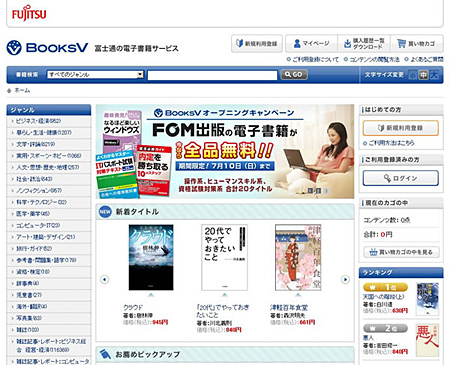 富士通は、PC/スマートフォン/タブレット端末向けの電子書籍サービス「BooksV」(ブックスブイ)の提供を、6月22日に開始した。30万点を超える国内最大規模のコンテンツを用意する、7月10日までは、FOM出版のPC操作解説や資格試験対策の書籍20点を無料で提供する。