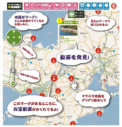 トップページの日本地図に、撮影地の位置情報をもとに3分前後の動画をマッピング。視聴は無料で、会員登録もなく、誰でもPCから視聴することができる。