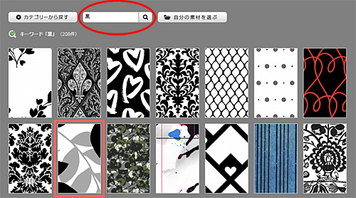 まずは、ホールマークのデザインから、黒を基調にしたシンプルかつ落ち着いた雰囲気のものを探す。PCサイトの「カバコレ」トップ画面から、「カテゴリから探す」をクリック。「新着」「人気」「シンプル」「ドット」などのカテゴリから気に入ったデザインを探したが、3044種類はあまりに多い……。迷ってしまったので、「キーワード」から探すことに。「黒」で絞り込んで検索したら、208件がヒット。ここから、葉をモチーフにしたモノトーンのクールなデザインを注文することにした。