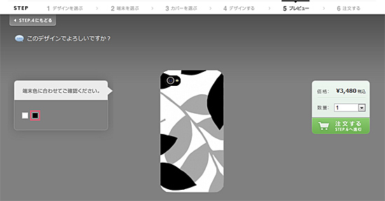 デザインを選ぶと、次にカバーを装着する端末を選ぶ画面が表示される。ここで「iPhone 4」を選び、次にデザインのベースとなるカバーの種類を選択する画面へ。しかし、現在は1種類しかないので、必然的にそれを選ぶことになる。ストラップホール付きのソフトカバーもラインアップしてほしい……。デザインを決めた後に、お気に入りの写真を挿入したり、文字を入れたりすることもできるが、このデザインはシンプルに仕上げたいので、そのまま注文。名前や住所を入力して次のステップに進むと、支払い方法を選ぶ画面になる。ここで「サービスコード全額支払い」を選び、「カバコレデザインカード」の裏面に書いてあるサービスコードを入力して、注文は完了。クレジットカードをもっていない人や、クレジットカード番号を入力することに抵抗があるという人には便利な仕組みだ。
