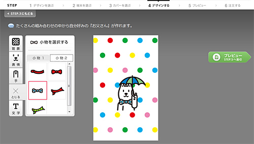 次に、遊び心をくすぐる「お父さん」デザインを作成した。トップ画面の「カテゴリ」から「白戸家お父さん限定デザイン」を選択。背景や「お父さん」の表情、手や小物の種類を自由に組み合わせることができる。「お父さん」の表情や小物などのパーツを選択する動作は、サクサクとできる。しかし、文字の入力は少し時間がかかる。PCがフリーズしたような感覚だが、10秒ほどたつと入力した文字が反映される。結局、今回は文字は入れず、水玉模様のなかで傘をさすお父さんデザインに仕上げた。最初のシンプルデザインと同じく、事前に用意しておいた「カバコレデザインカード」のサービスコードを入力して注文は完了。