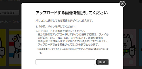 最後に、手持ちの写真でカバーをつくった。トップ画面の「自分の素材を選ぶ」から、PCに保存してある写真を選択し、「アップロード」をクリックして決定すればOK。「スタンプ」と表示された部分のイラストを選んだり、文字を入力したりすることで、さらにオリジナリティのあるカバーに仕上げる仕組みだ。今回は、手持ちの写真データと、植物・自然のパーツを一つ選び、「Good luck!」という文字を組み合わせた。