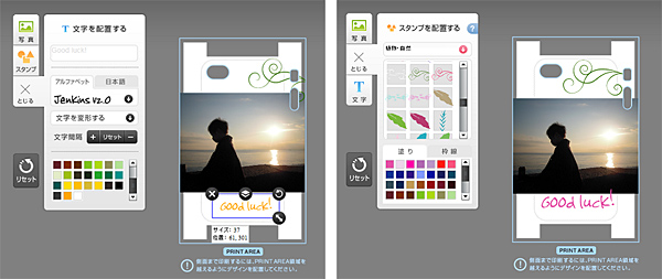 イラストや文字を入力するときには、データの読み込みに10秒ほどかかる。少し待って、画像や文字が表示されたら、それぞれ拡大/縮小や回転などで、自由にレイアウト変更。無事に世界に一つだけのカバーを注文できた。