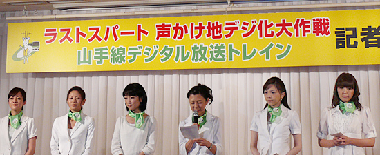 7月1日の午前4時20分に出発式を行い、午後には都内で記者会見を開催。記者会見には、NHKと民放5局の女子アナウンサーが、それぞれ山手線デジタル放送トレインで取り組むことを説明した。