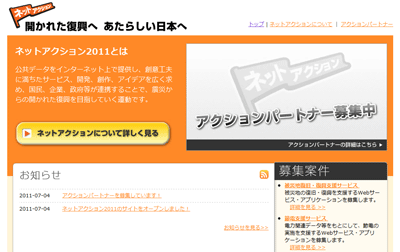 「ネットアクション2011」のポータルサイト(http://netaction.openlabs.go.jp/)で開発・創作の材料となる公共データに関する情報を集約して提供。東日本大震災からの復旧・復興や節電のためのアプリケーションやコンテンツの開発・創作などを呼びかける。さらに、民間の投稿サイトなどと連携し、開発・創作されたアプリケーションやコンテンツの集約を進めて行くほか、民間のコンテストなどとも連携し、すぐれたアプリケーションやコンテンツを顕彰する。