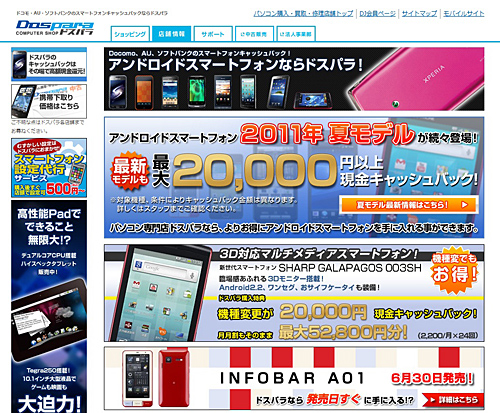 7月31日までのキャンペーン期間中、手持ちの携帯電話を下取りに出し、「GALAXY S II SC-02C」や「INFOBAR A01」など、ドスパラ指定のAndroid搭載スマートフォンを新規契約・機種変更・MNPで購入し、指定プランで契約した場合に限り、最大2万円をキャッシュバックする。