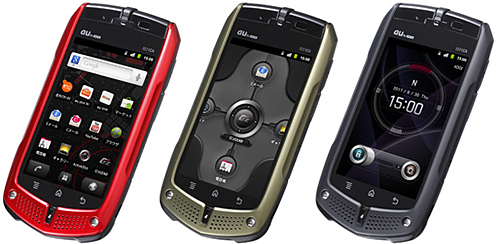 G'zOne IS11CA(左から、レッド、カーキ、ブラック)