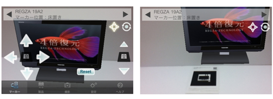 iOS版アプリは、新機能として、AR技術で合成表示する「レグザ」の画面上で最新テレビCMを再生する「ARムービー再生」機能と、シミュレーション中に「レグザ」の表示位置を変更できる「ポジションコントローラー」機能を搭載。従来は表示位置を変更する場合、ARマーカーそのものの位置を移動させる必要があったが、「ポジションコントローラー」機能によって、ARマーカーを動かすことなく、場所の微調整や狭い廊下での搬入をシミュレーションすることができる。