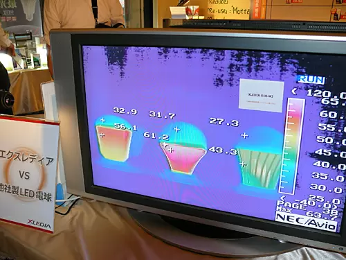 会場では、「エコ」「節電」などの観点からLED電球のよさを来場者にわかりやすく説明し、白熱電球を比べてLED電球の寿命が長いことや電気代が安いこと、他社製LED電球と比較した「XLEDIA」の長寿命をアピールしていた。