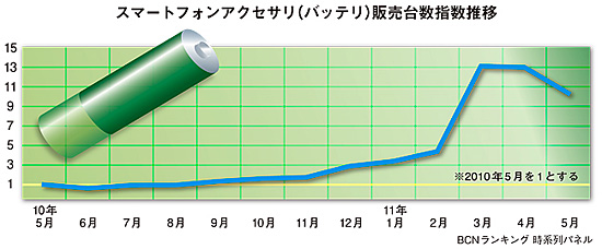 その動きは、BCNランキングの「スマートフォンアクセサリ」をみると一目瞭然。スマートフォンのバッテリだけを抽出し、昨年5月の販売数量を1として指数化すると、今年3月は13倍という急伸ぶりだ。4~5月も10~12倍という大きな伸びを示している。Android OS搭載のスマートフォンの普及に比例して、対応バッテリの販売数量は昨年から増加傾向にあったが、3月以降の急激な伸びは、この影響だけでは説明しきれない。