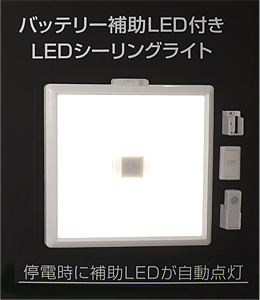 こうした「内蔵バッテリに充電する外付けバッテリ」や「交換バッテリ」の需要が拡大している一方で、より直接的に停電に備えたバッテリ搭載製品も好調のようだ。東芝ライテックは、バッテリ内蔵のLEDシーリングライト「LEDH94210H-LC」を7月15日に発売する。停電を検知すると、補助LEDが自動で点灯する製品だ。