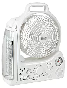 20cmファンの扇風機で、12~14時間の充電で最大8時間弱、連続作動する。LEDライトは36灯で、最大16時間点灯。さらに、市販の蚊取りマットを使う蚊取り機能や、AM/FM両対応のラジオ、秒針付きのアナログ時計を搭載する。