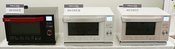 ラインアップと価格は、容量30Lで2段調理のタッチパネルを搭載した「PX-PX2」が16万円前後、タッチパネル非搭載のスタンダードモデル「AX-GX2」が11万円前後、26Lで1段調理の「AX-MX2」が7万5000円前後、18Lで1段調理のコンパクトモデルの「AX-CX2」が6万円前後の見込み。カラーは全モデルでレッド系とホワイト系をラインアップする。さらに、コンパクトモデルの「AX-CX2」には、独身の若い女性をメインターゲットに、新たにピンク系を加えた。