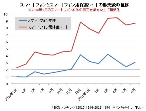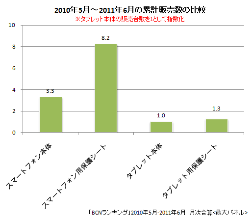 保護シートの2011年6月の税別平均単価は、スマートフォン用が659円、タブレット用が1615円。差はわずか1000円だが、1000円を超えるか否かは心理的に大きいもの。スマートフォン用保護シートが本体の2.5倍も売れた要因は、気軽に買える価格の安さと、よりよいものを求め、期間中に複数購入した人の多さが挙げられるだろう。