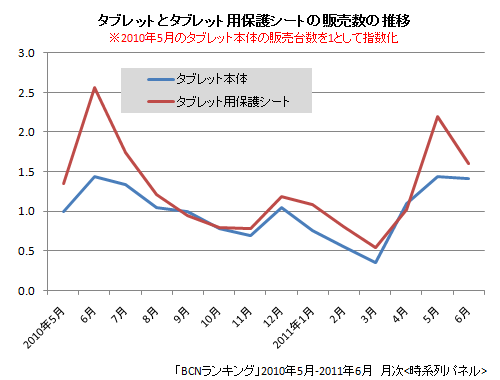 一方、タブレット用液晶保護シートは、タブレット本体の売れ行きと連動している点は同じだが、iPad発売直後の2010年5~7月、iPad 2発売直後の2011年5~6月の二つのピーク時期とそれ以外の月の差が大きく、スマートフォン用保護シートほどは伸びていない。