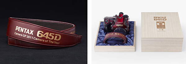 ボディ前面の「PENTAX」ロゴと、上面のモードダイヤル銘板の凸部は金メッキ処理。グリップのラバー部は、ツヤのある半光沢の黒に仕上げた。特別仕様のストラップには、「Camera GP 2011 Camera of The Year」の文字と「PENTAX 645D」のロゴが金色で入る。
