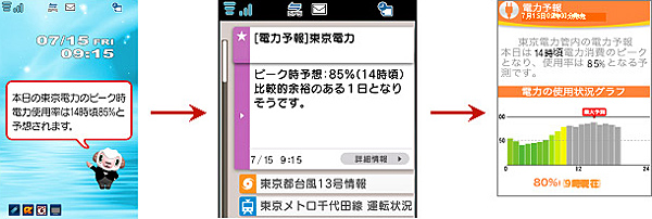 「電力アラーム」は、電力会社が公開した電力の使用状況に関する情報をもとに、電力の需給状況が厳しくなったときに、iコンシェルのキャラクターである「執事」がアラームを鳴らして知らせるサービス。「電力予報」は、毎朝、電力使用率のピーク時予報で、その日のスケジュールと使用率の予報を照らし合わせることができる。