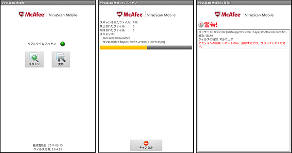 「マカフィー ウィルススキャンモバイル」のトップ画面/スキャン画面/検出画面