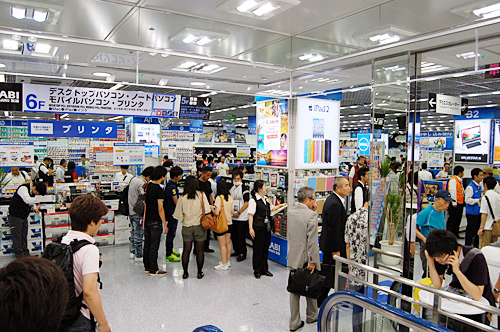 朝から気温30度を超える猛暑となったオープン当日は、開店時間を前倒しして、予定より30分早い9時30分にオープン。多くの人が来店しようと売り場に駆け込んだ。季節柄、エアコンや扇風機を購入する人が目立っていた。また、デジタルカメラコーナーは、若者を中心に賑わっていた。
